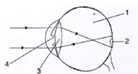 - #4-cName the parts labelled 1 to 4Ans : 1-vitreous humour, 2-blind spot, 3-lens, 4-pupil