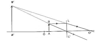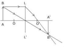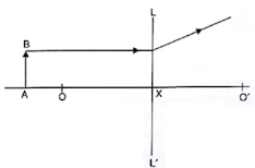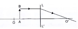 (i) Name the lens LL’ (ii) what are the points O, O'called? (iii) Complete the diagram to form the image of the object AB. (iv) State three characteristics of the image.