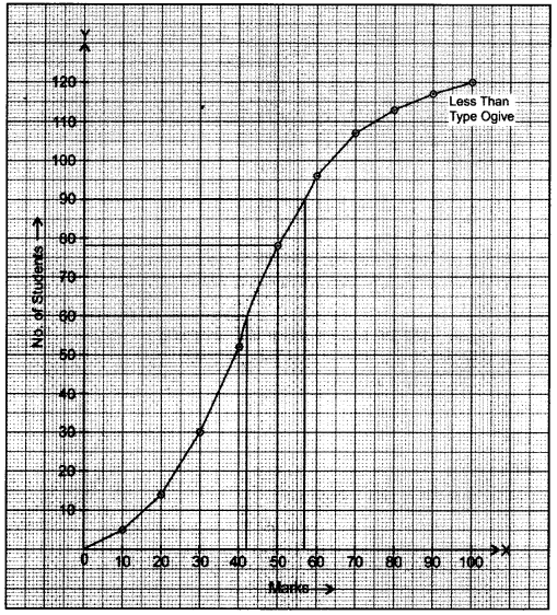 Plot the points (10, 5), (20, 14), (30, 30), (40, 52), (50, 78), (60, 96), (70, 107), (80, 113), (90, 117), (100, 120). On the graph paper by taking upper limits on x-axis and number of students on y-axis. Join them free hand to get smooth curve.