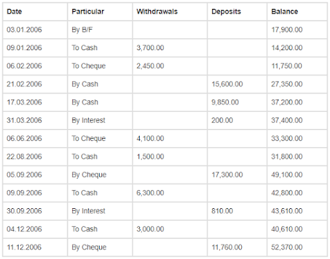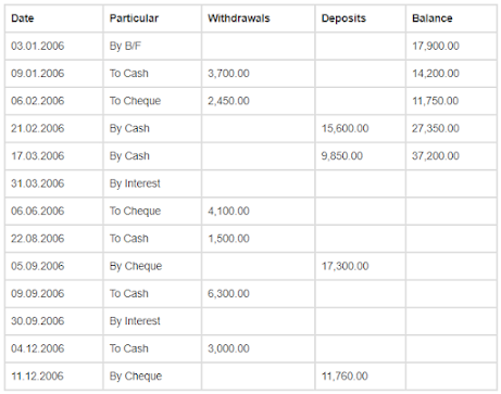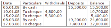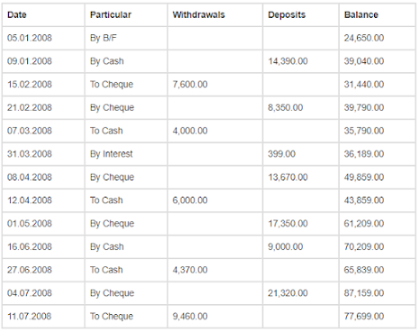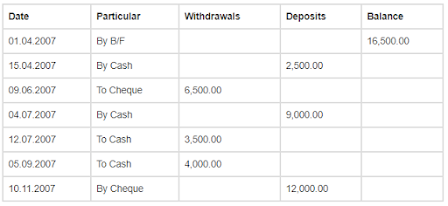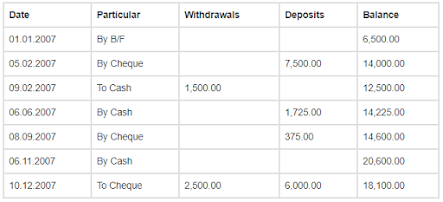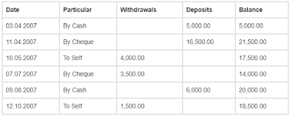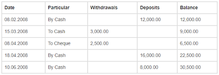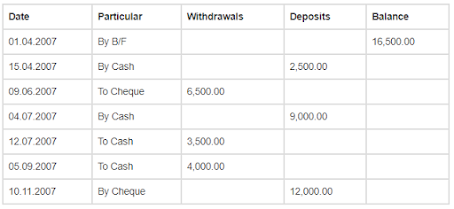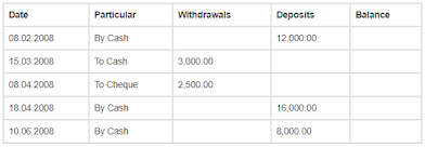 So, the table contains 5 columns. The data in 5 columns are, (i) Date (ii) Particulars (iii) Withdrawals (iv) Deposits (v) Balance.