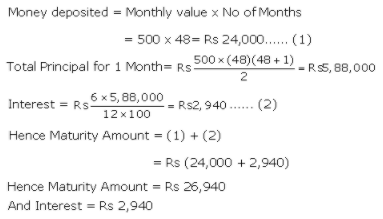 Given that recurring deposit per month = Rs 500, Period = 4 years = 48 months,