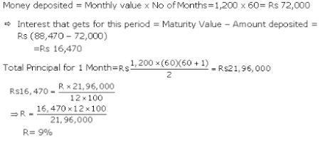 Given that Recurring deposit per month = Rs 1,200, Period = 5 years = 60 months, R = R%, Maturity value = Rs 88,470