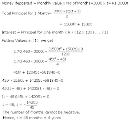 7. Mr. Banerjee opens a recurring deposit account for Rs 3,000 per month at 9% simple interest p.a. On maturity, he gets Rs 1,70, 460. Find the period for which he continued with the account.