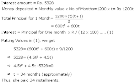 8. Mr. Saha opened a cumulative deposit account of monthly installment of Rs 1,200 at 9% p.a. simple interest. She earned a total interest of Rs 5,328. How much installments did she pay?