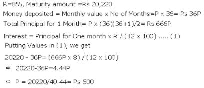 9. What should be minimum monthly deposit in a recurring deposit for 3 years to get Rs 20,220 on maturity after 3 years at an interest rate of 8%. P.a.