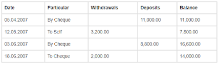 2. Ms. Chitra opened a saving bank account with SBI on 05.04.2007 with a cheque deposit of Rs 11,000/. Subsequently, she took out Rs 3,200/- on 12.05.2007; deposited a cheque of Rs. 8,800/- on 03.06.2007 and paid Rs 2,000/- by cheque on 18.06.2007.