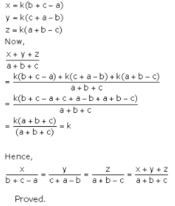 11. If x/(b + c - a) = y/(c + a - b) = z/(a + b - c), then prove that each ratio is equal to the ratio of (x + y + z)/(a + b + c).