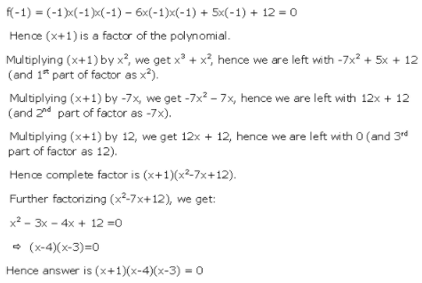 19. Prove that (x + 1) is a factor of x3 - 6x2 + 5x + 12 and hence factorize it completely.
