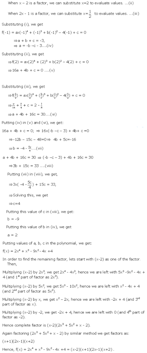 22. The polynomial f(x) = ax4 + x3 + bx2 - 4x + c has (x + 1), (x - 2) and (2x - 1) as its factors. Find the values of a, b, c and remaining factor.