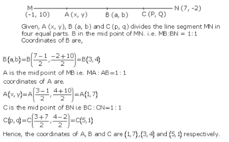 6. The points A, B and C divides the line segment MN in four equal parts. The coordinates of M and N are (- 1, 10) and (7, - 2) respectively. Find the coordinates of A, B and C.