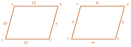 ABCD and PQRS are similar figures. AB = 12 cm, BC = x cm, CD = 15 cm, AD = 10 cm, PQ = 8 cm, QR = 5 cm, RS = m cm and PS = n cm. Find the values of x, m and n.