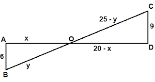 AD and BC are two straight lines intersecting at O. CD and BA are perpendiculars from B and C on AD. If AB = 6 cm, CD = 9 cm, AD = 20 cm and BC = 25 cm, find the lengths of AO, BO, CO and DO.