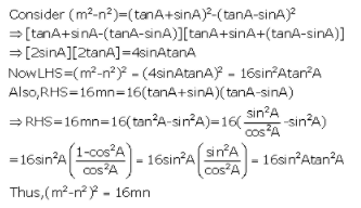 7. If tan A + sin A = m and tan A - sin A, prove that (m2 - n2)2 = 16 mn