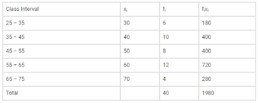Class | 25 - 35 | 35 - 45 | 45 - 55 | 55 - 65 | 65 - 75 |