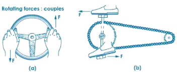 16. Draw a neat labeled diagram to show the direction of two forces acting on a body to produce rotation in it. Also mark the point about which rotation takes place.