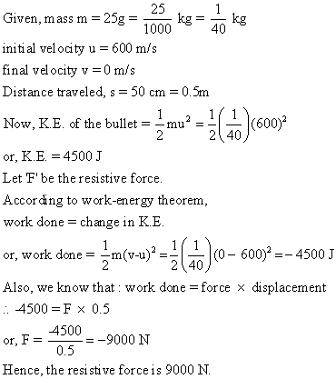 62. A bullet of mass 25 g has a velocity of 600 ms-1. What is the kinetic energy of the bullet? If it penetrates 50 cm into a target, find the resistive force offered by the target.