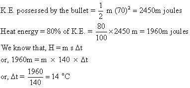 63. A lead bullet moving at 70 ms-1 is brought to rest on hitting a target. If 80% of its energy is converted into heat energy, find the rise in temperature (Sp. Heat cap. Of lead is 140 J/kgK).