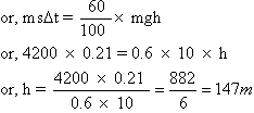 64. If 60% of the potential energy available in a waterfall is converted into heat energy, find the height of the waterfall, when the temperature difference between the top and the bottom of the fall is 0.21°C (sp. Heat cap. Of water = 4200J/kg K).