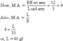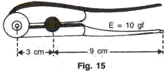 69. A pair of nut crackers is 12 cm long. An effort of 10 gf is required to crack a nut which is passed at a point 3 cm from the finger. Calculate the load (Fig. 15).