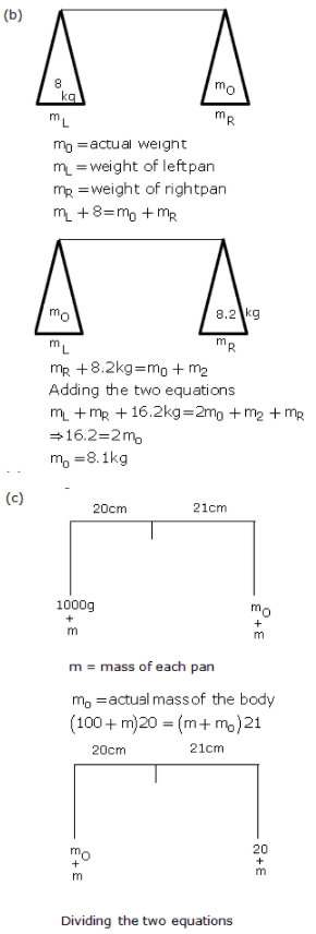 (b) A faulty balance of equal arms but pans of unequal weight is used to find the weight of a body. By the method of double weighing the weights are found as 8 kg and 8.2 kg. Find the actual weight of the body.