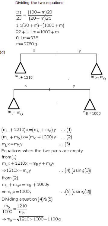 (d) A faulty balance of unequal arms and pans of unequal weights is used to find the true weight of a metal. By double weighing the weights are found to be 1210 g and 1000 g. Calculate the true weight of the metal.