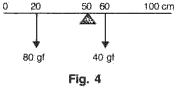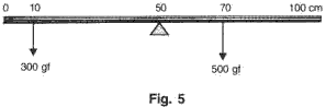 28. Fig. 5 shows a uniform meter scale weighing 200 gf. Provided at its centre. Two weights 300 gf and 500 gf are suspended from the ruler as shown in the diagram. Calculate the resultant torque of the ruler and hence calculate the distance from mid-point where a 100 gf should be suspended to balance the meter scale.