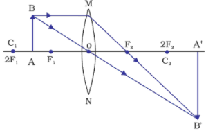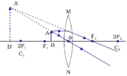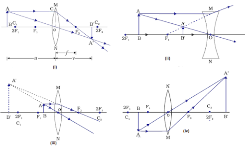 1. A convex lens is thicker in the middle and thinner at its edges. 2. A light beam converges on passing through a convex lens. 3. The convex lens produces a real image that is inverted and is smaller and can be obtained on screen. | 1. A concave lens is thicker at the edges and thinner in the middle. 2. A light beam diverges on passing through a concave lens. 3. A concave lens always forms a virtual image, the image is magnified and cannot be obtained on screen. |