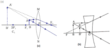 (b) In both the cases the image formed is virtual, upright and on the same side of the lens but the image formed by a convex lens is magnified and that formed by a concave lens is diminished.