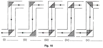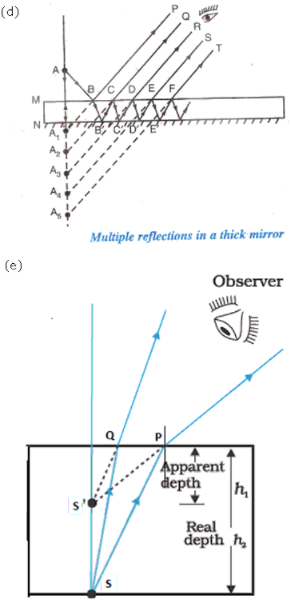 (d) A thick plane mirror produces several faint images in addition to a prominent one. Draw a ray diagram showing how reflection and refraction produce all these images.