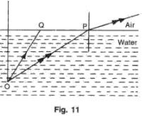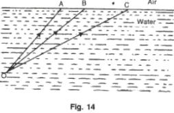 (i) Fig. 14 shows three rays of light OA, OB and OC passing from water to air, making angles 49°, 41° and 35° with the horizontal surface respectively. Draw an approximate path of the emergent ray for each. (Critical angle of water is 49°.)