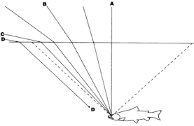 Since, light is coming into the water from all directions, refraction creates a cone of light with its base on the surface and its apex at the fish's eye. The base of the cone is a circular opening at the surface through which the fish sees the entire outside world. This opening is called the "Fish's Window". Only the light passing through the window enters the fish's eye. Notice line "D," It's a ray entering the water beyond the window; refraction bends it such that it cannot reach the fish's eye.