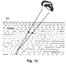 (e) Fig. 12 represents a stone S at the bottom of a pond of water. Using the two rays, as shown, complete the ray diagram to show where the image of the stone appears when viewed from E.