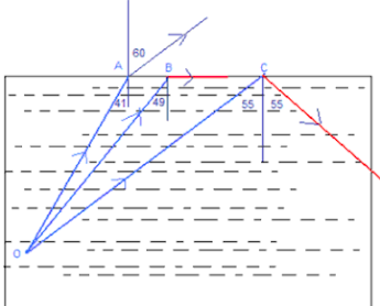 OA making an angle of 49° with horizontal, hence iA = 90° - 49° = 41° OB making an angle of 41° with horizontal, hence iB = 90° - 41° = 49° OC making an angle of 35° with horizontal, hence ic = 90° - 35° = 55°Given critical angle = 49°. So all incident angles in denser media, more than 49°, will undergo total internal reflection.(Ray OC)i = critical angle will graze through the interface (Ray OB).