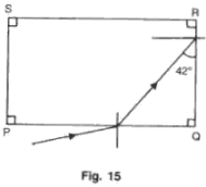 (a) A ray of monochromatic light enters glass PQRS as shown in the fig. 15. Complete the path of ray till it emerges from the glass. (Critical angle of glass is 42°).