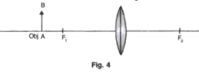 8. An object AB is placed in front of a convex lens as shown in fig. 4. Complete the ray diagram and obtain the image formed and state the nature of the image.