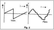 33. In fig. 2 two musical notes of the same pitch and same loudness are played on a violin and on a piano. Their wave forms are as shown in the diagram below. Explain why the wave patterns are different.