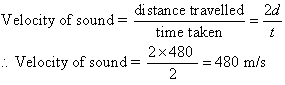 3. A boy fires a gun and hears the echo 2 seconds later. If he is 480 m away from a wall, calculate the velocity of sound in air.