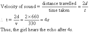 4. A girl claps and hears the echo after reflection from a cliff which is 660 m away. If the velocity of sound is 330 ms-1, calculate the time taken for hearing the echo.