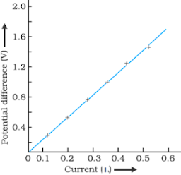 At constant temperature, if current is plotted against potential difference, the plot will be a straight line making some slope with the x-axis as shown in figure below: