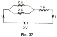 In given, circuit, two 2 ohm resistors in series are connected in parallel with another 2 ohm resistor;