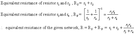 In the given network, the series combination of resistors, r1 and r2, is connected in series with the parallel combination of resistors, r3 and r4 .