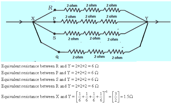 60. A combination consists of three resistors in series. Four similar sets are connected in parallel. If the resistance of each resistor is 2 ohm, find the resistance of the combination.
