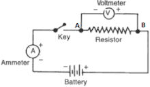In the given diagram, ammeter is connected in parallel and voltmeter in series, which is wrong. Also the terminals of the two devices are wrongly connected to the battery.