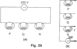 30. The diagram shows two ways of connecting three lamps P, Q and R to A.C. supply of 220 V.