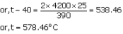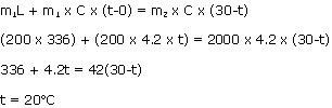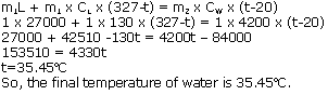 m1L + m1× CL× (327-t) = m2 ×Cw× (t-20)⇒ 1×27000 + 1×130×(327-t) = 1×4200×(t-20)⇒ 27000 + 42510 - 130t = 4200t - 84000⇒ 153510 = 4330 t⇒ t = 35.45°C