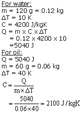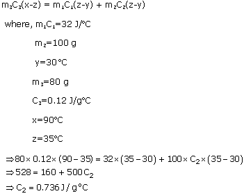 8. A copper calorimeter of heat capacity 32 J/°C contains 100 g of oil at 30°C. 80 g of a metal of sp. heat cap. 0.12 J/g°C at 90°C is dropped into the oil and final temperature is 35°C. Calculate the specific heat capacity of the oil.