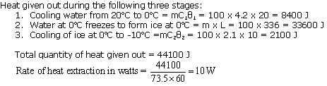 26. A refrigerator converts 100 g of water at 20°C to ice at -10°C in 73.5 minutes. Calculate the average rate of heat extraction from water in watt. (Specific heat of ice= 2100 J/kgK, sp. heat of water = 4200 J/kgK, Sp. latent heat of ice = 336000 J/kg.)