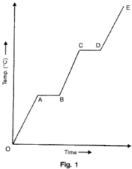 (c) A substance is heated at a constant rate from a low temperature to a high temperature. A graph of temperature against time is drawn and is shown in fig. 1. Which part of parts of the graph corresponds to the substance existing in two states ?