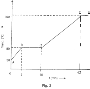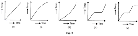 (e) A solid is heated at a constant rate in an insulated container till half of it vapourises. Which graph in fig. 2 shows the temperature changes during this time ?