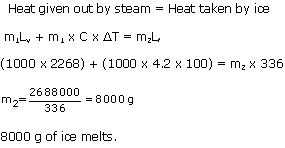31. What mass of ice at 0oC will be required to cool 0.9 kg of water from 35oC to 0oC? Assume all the ice used melts. The specific heat capacity of water is 4.2 x 103 J/kgoC and specific latent heat of fusion of ice is 336 x 103 J/kg.